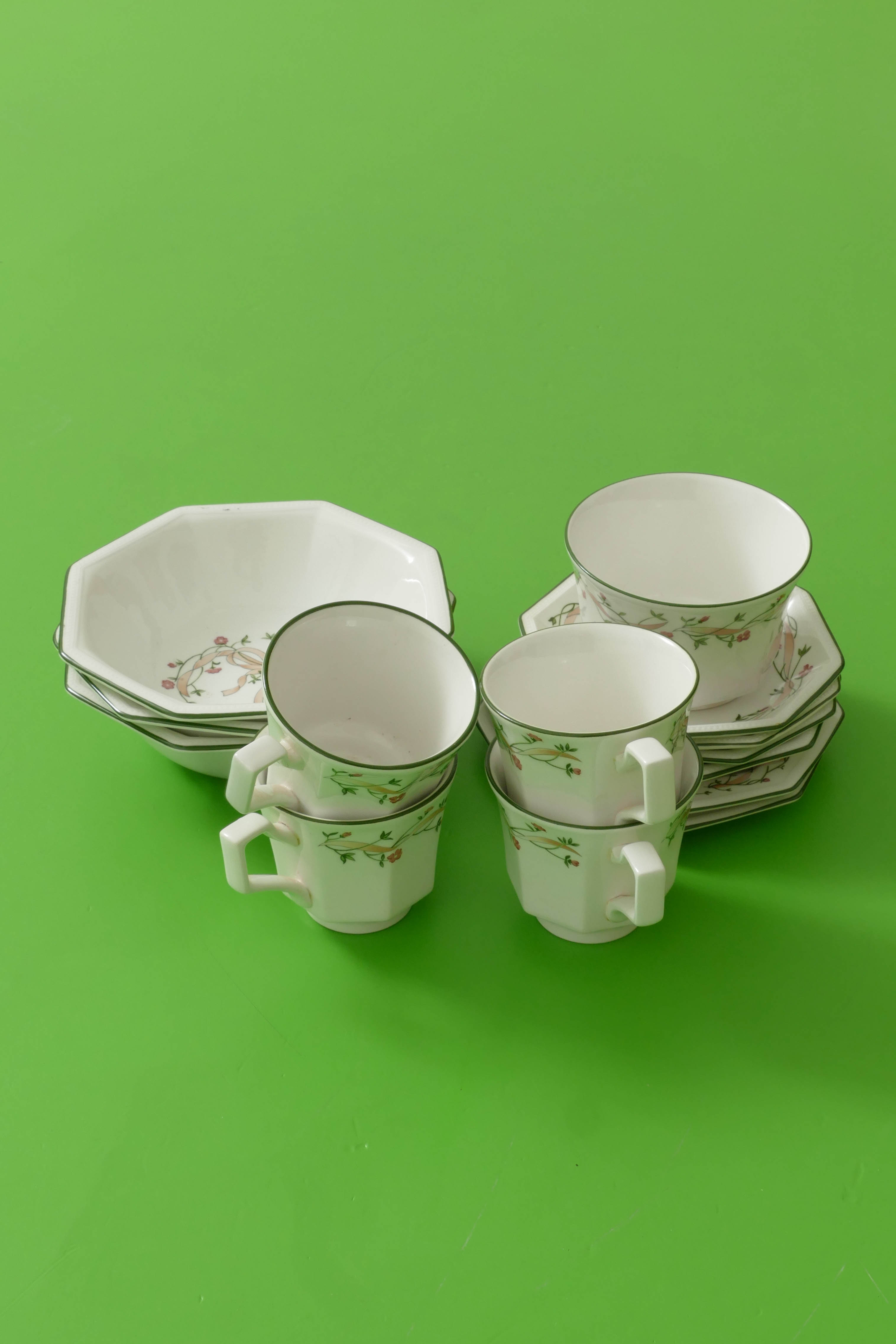 Mõõdud: Taldrik (4tk) 13.5 cm; taldrik (2tk) 15.5 cm; kauss (3tk) 17x5 cm; suhkrutoos 10x7 cm; kruus (4tk) 8x8 cm